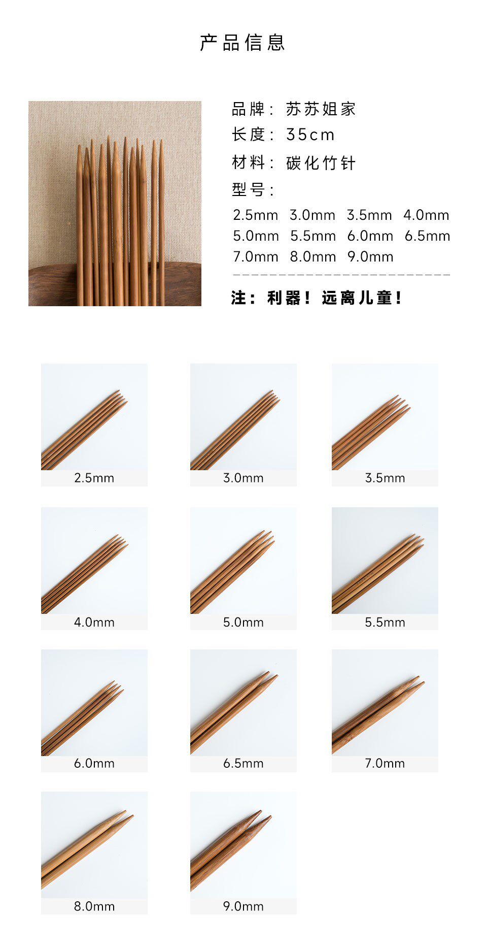 Sort by color 35cm, 2.5mm thick, 5 pieces per pair,35cm, 3.0mm thick, 5 pieces per pair,35cm, 3.5mm thick, 5 pieces per pair,35cm, 4.0mm thick, 5 pieces per pair,35cm, 5mm thick, 4 pieces per pair,35cm, 5.5mm thick, 4 pieces per pair,35cm, 6mm thick, 4 pieces per pair,35cm, 6.5mm thick, 2 pieces per pair,35cm, 7mm thick, 2 pieces per pair,35cm, 8mm thick, 2 pieces per pair,35cm, 9.0mm thick, 2 pieces per pair,5mm Bamboo Ring Needle - 80cm long,6mm Bamboo Ring Needle - 80cm long,10mm Bamboo Ring Needle - 80cm long