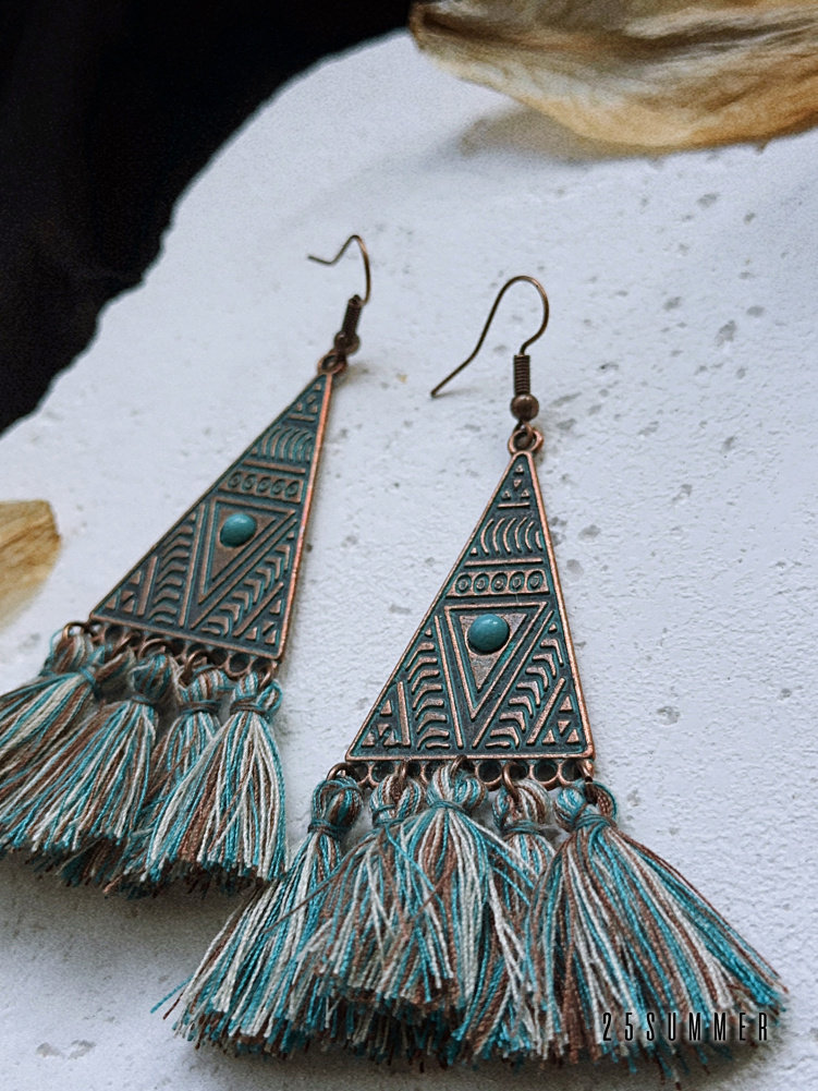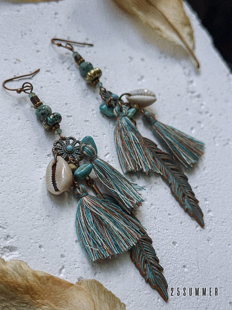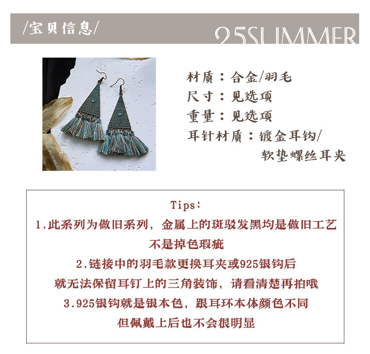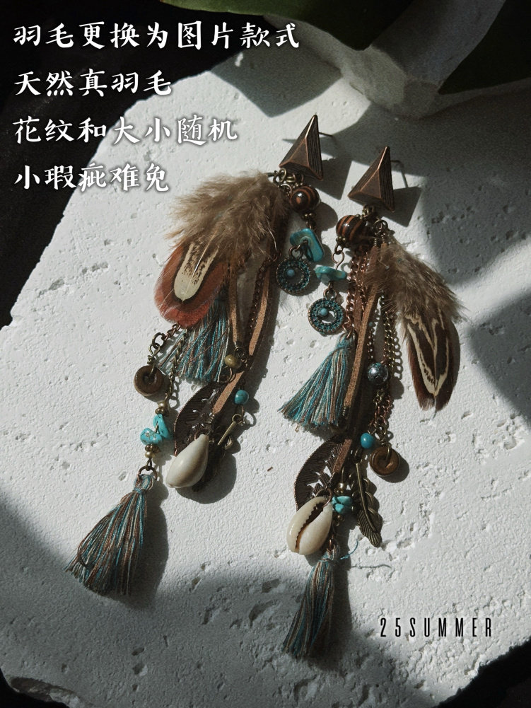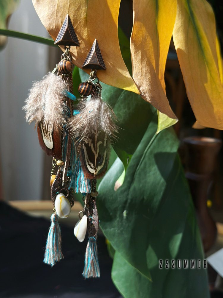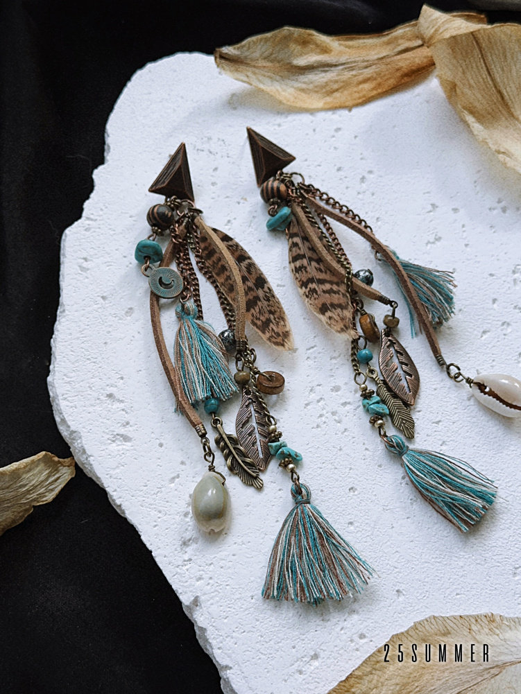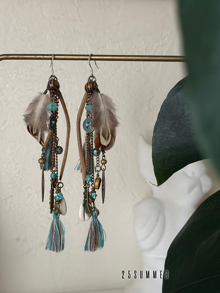 25SUMMER Tribal Princess Wandering Style Distressed Feather Tassel Earrings Retro Ethnic Style Earrings for Women