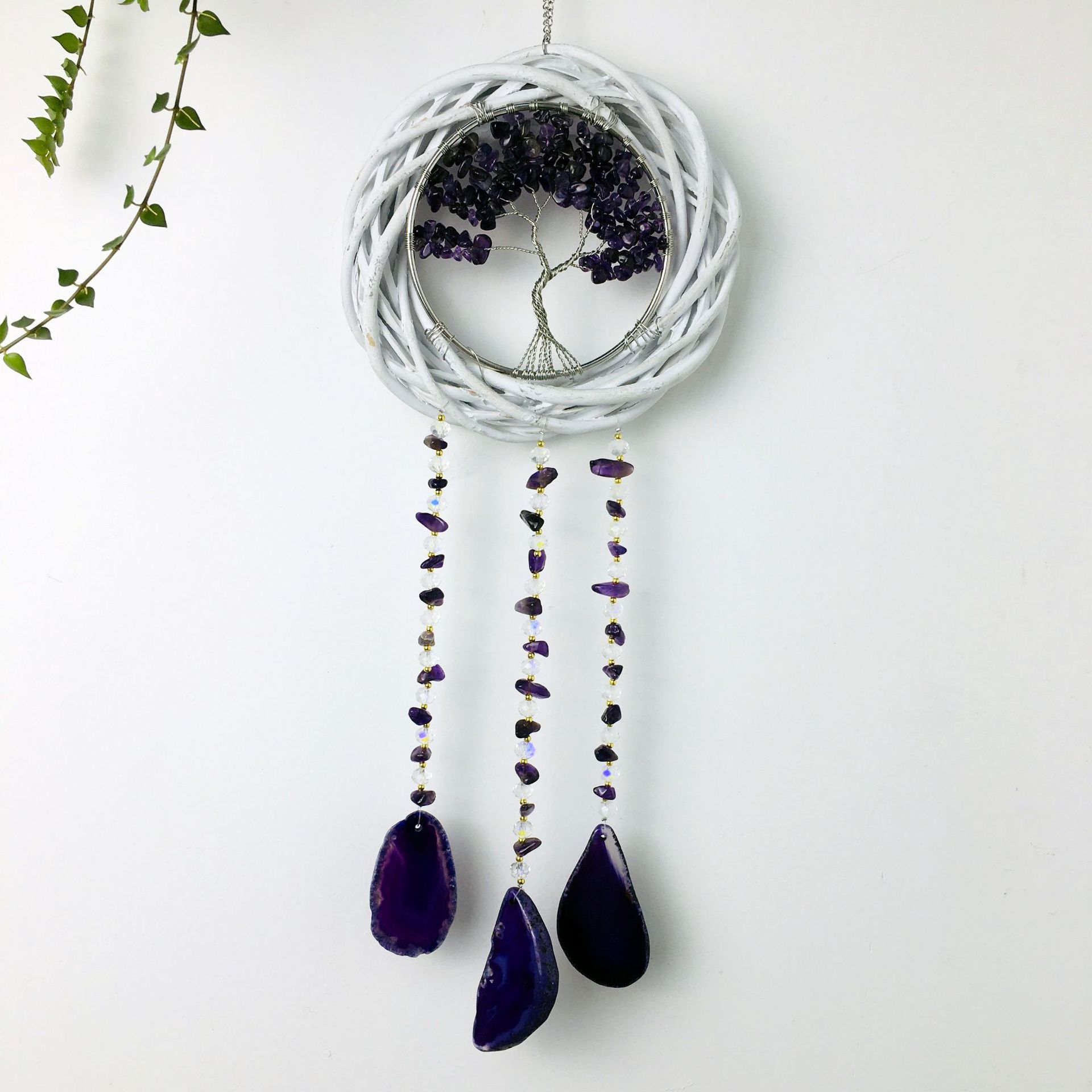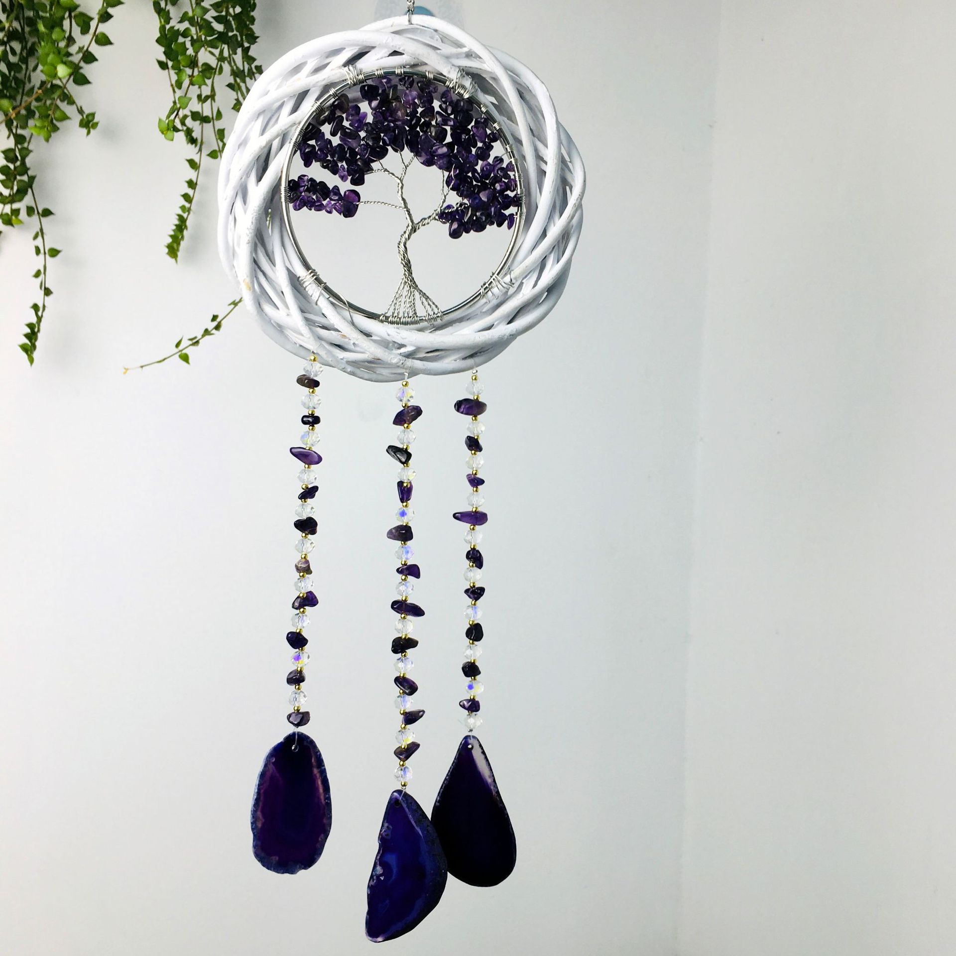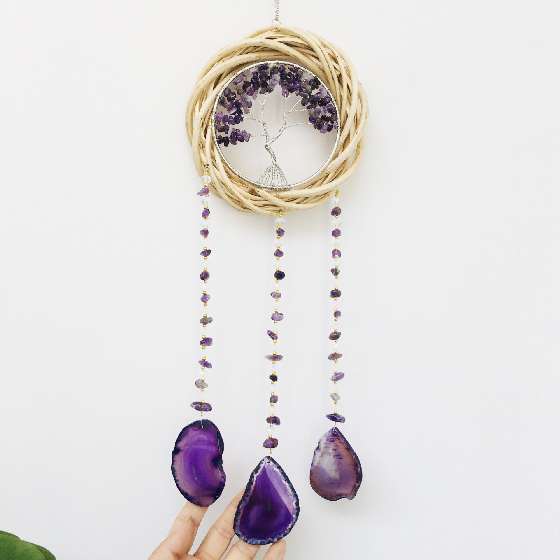Wall hanging wicker wreath cross-border natural amethyst hand-wound tree of life agate piece wind chime factory wholesale